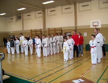 - Das Training beginnt, wenn der Lehrer den Befehl zur Aufstellung gibt. Üblicherweise wird der Trainer vom ersten Schüler (vorne rechts) auf koreanisch gegrüßt, dann verbeugt sich die Gruppe zum Lehrer und der Lehrer zur Gruppe hin. Einige Schulen legen Wert darauf, dass beim Begrüßungszeremoniell zusätzlich die Fahne Koreas gegrüßt wird.